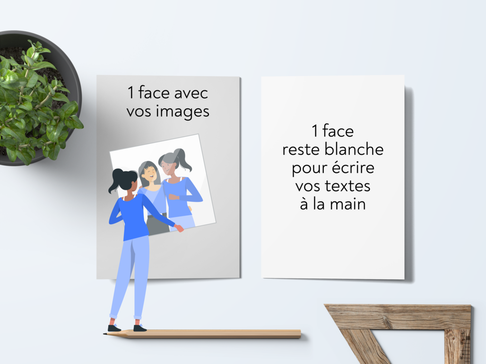 Carte verticale, plate, rectangulaire. Impression couleur recto, sur carte graphique 350g. Personnalisation de l’avant de la carte. La page arrière reste blanche.